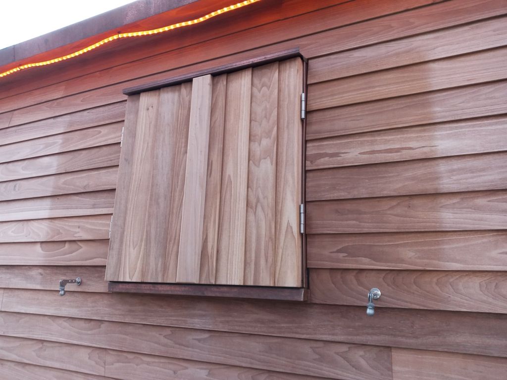 Hier mit einem Aufbau aus Thermo-Aspe , Kantenverkleidungen in Kupfer und dem Innenausbau in Zirbe.