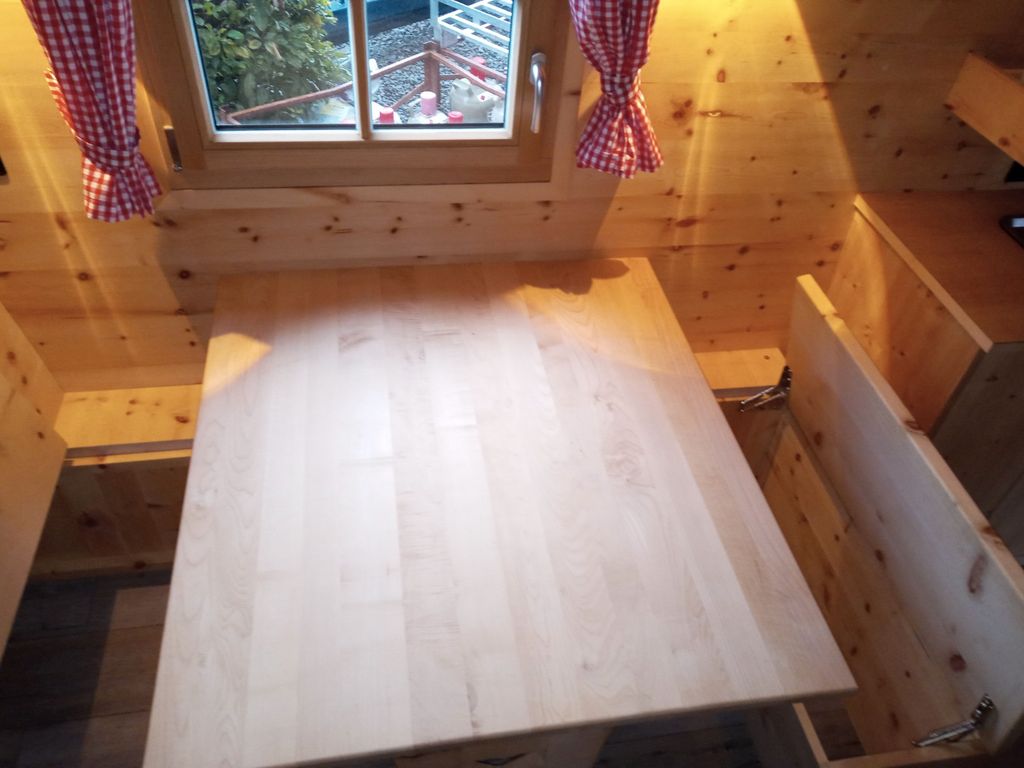 Gegenüber liegende Klappbänke mit Tisch in der Dinette