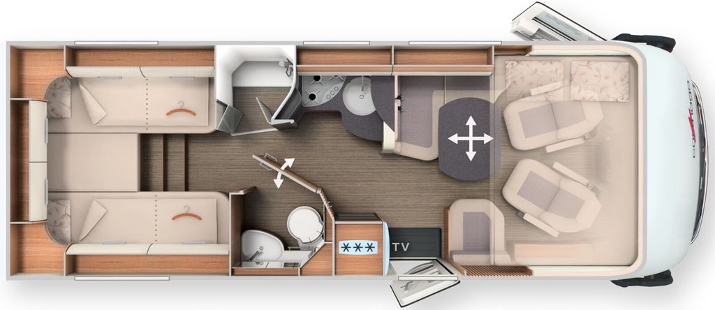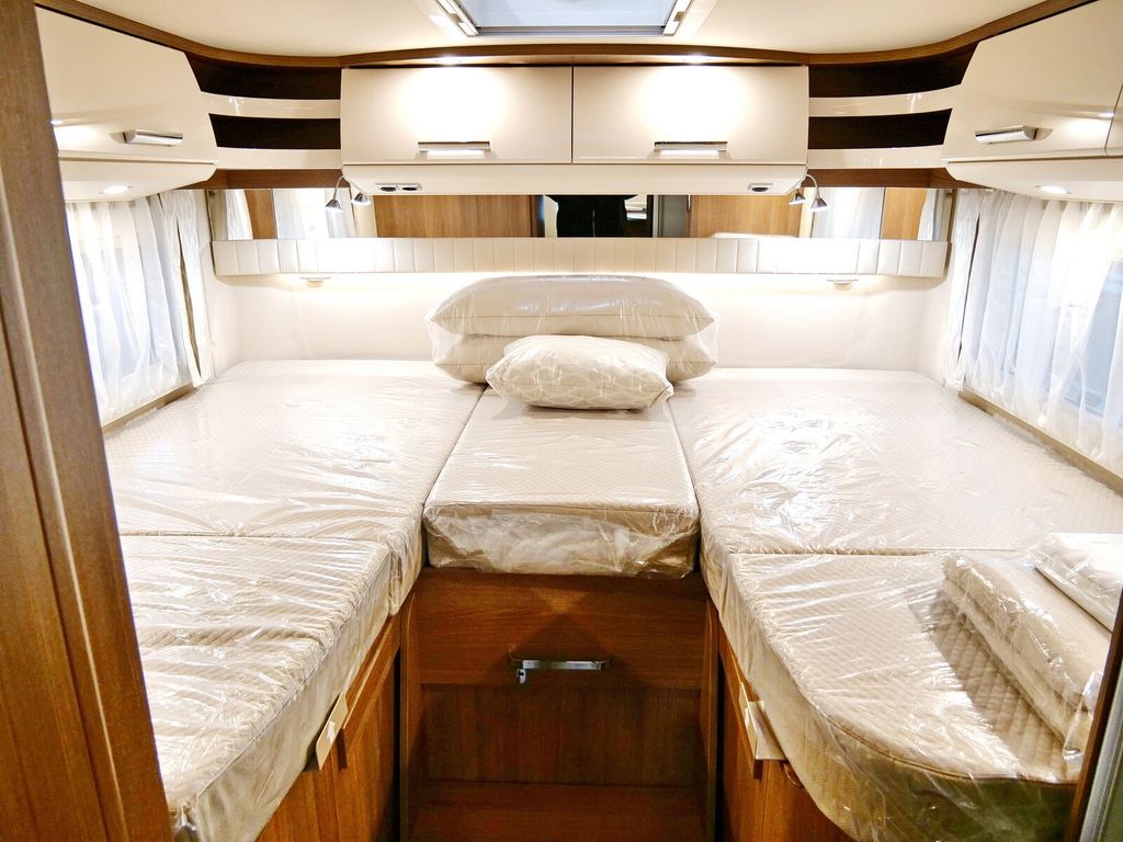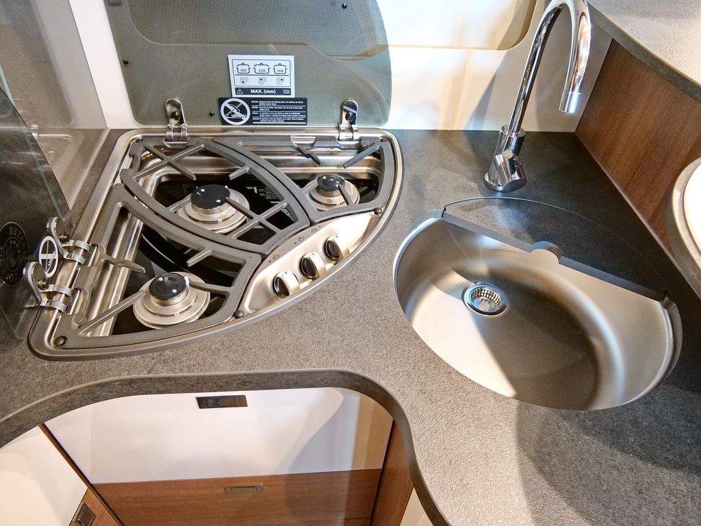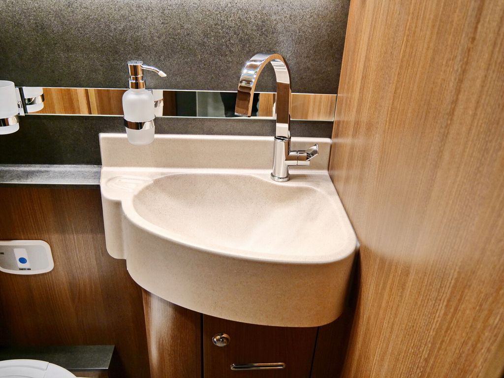 Wohn-Komfort-Paket *(Lightweight-Einstiegstreppe ausziehbar inklusive Liegeflächenerweiterung, Multifunktionale Spülabdeckung für zusätzliche Wandaufnahme zur Arbeitsflächenerweiterung, Zusätzliches Spiegel-Element in Raumbad, Regal-Einlegeboden unter den Längseinzelbetten)