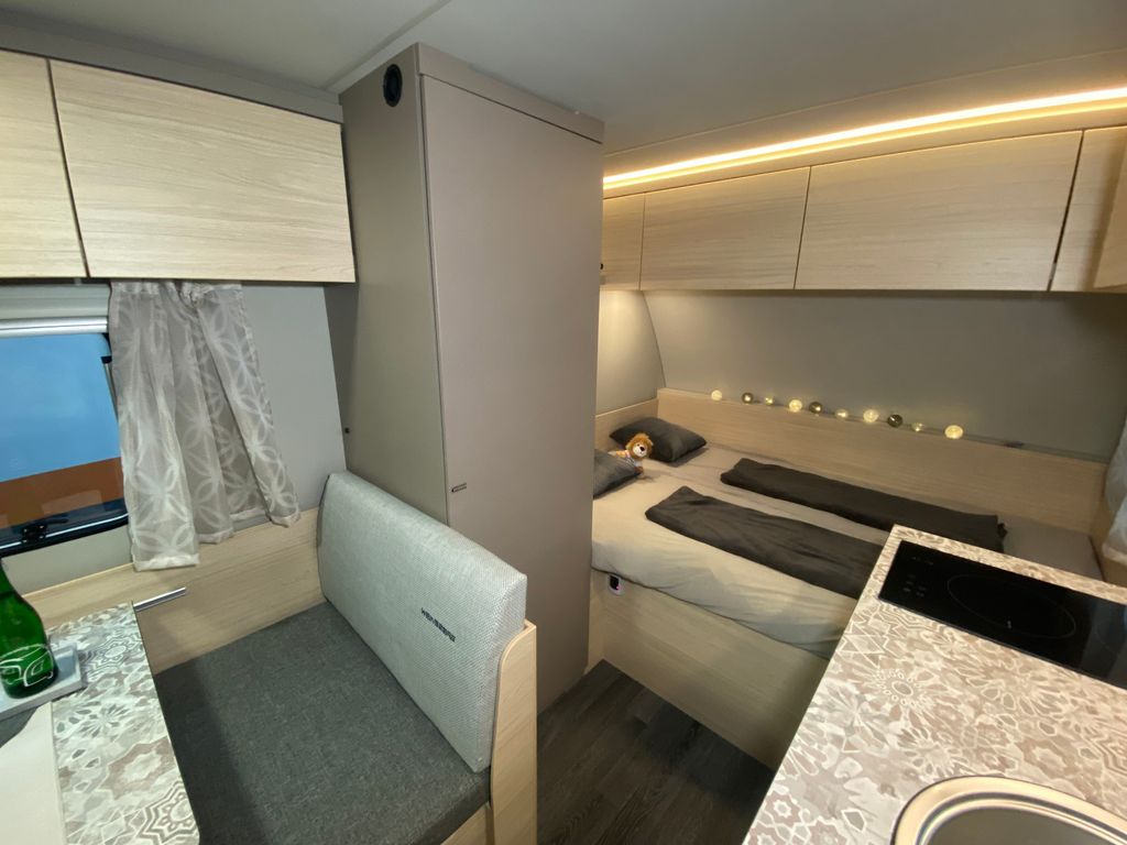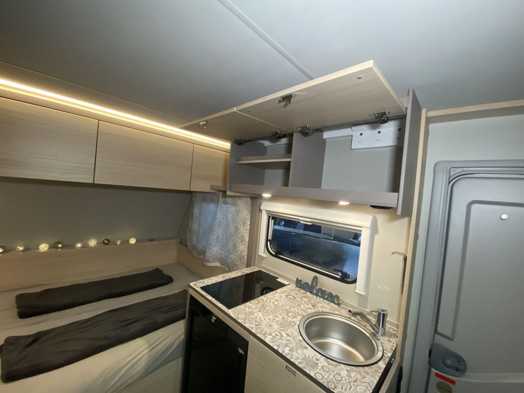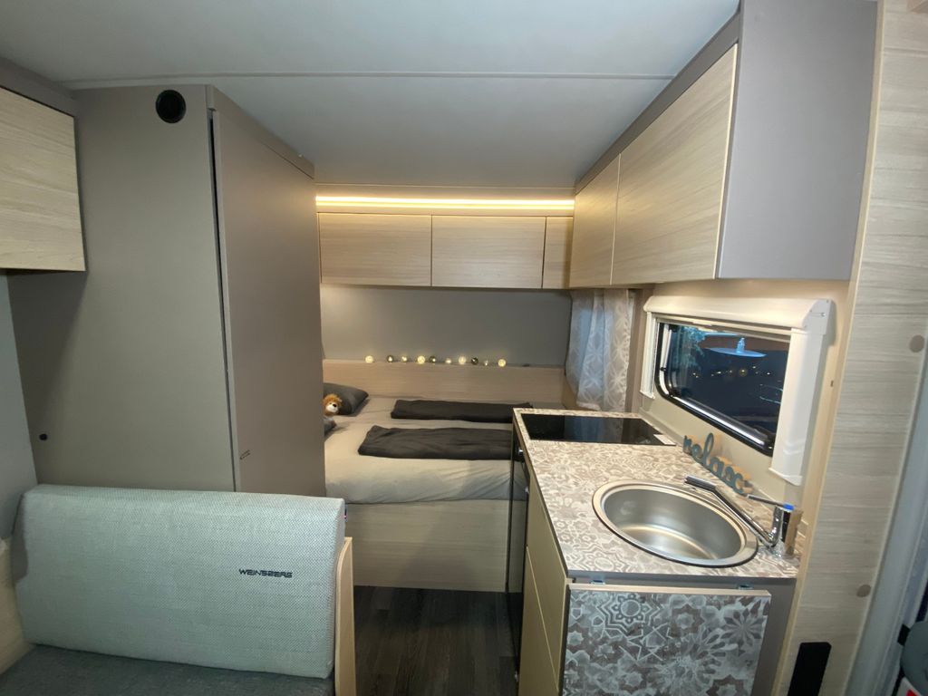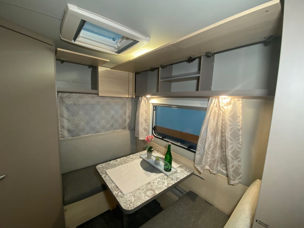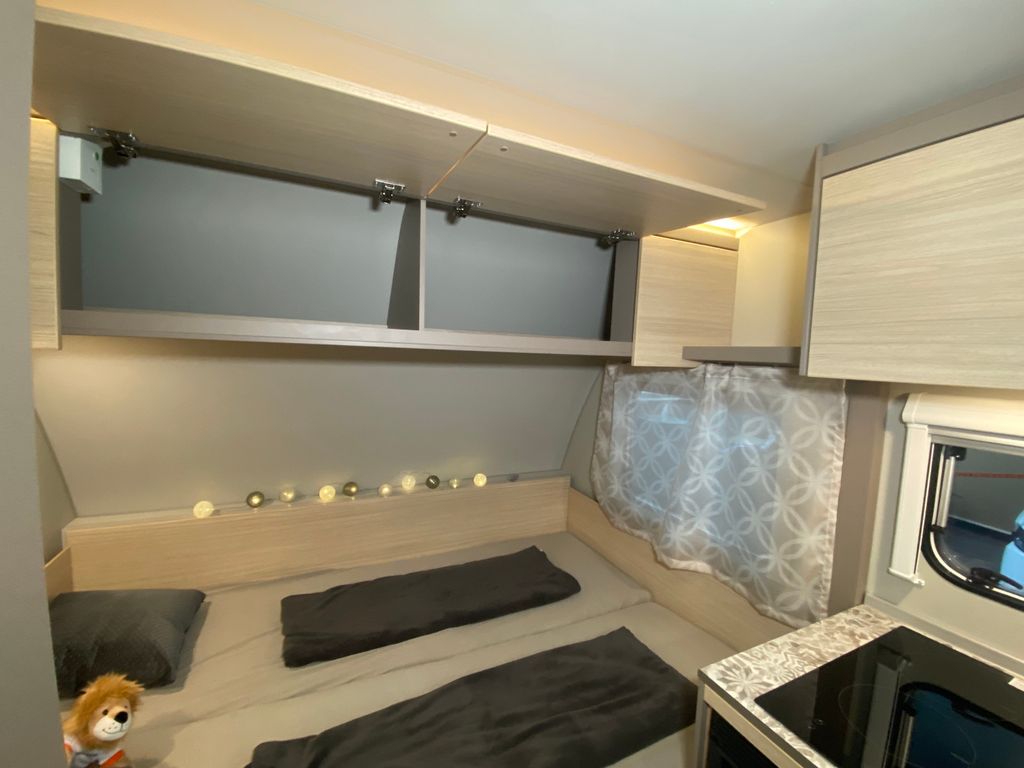 CaraCito Paket Vorzeltleuchte mit Regenrinne in LED Technik, Hydraulische Radstoßdämpfer, Frischwassertank 45 Liter Festeinbau, Schwerlastkurbelstützen, Stabilisator-Sicherheits-Kupplung, Kombi-Rollos an den Fenstern inkl. Verdunklung und Insektenschutz