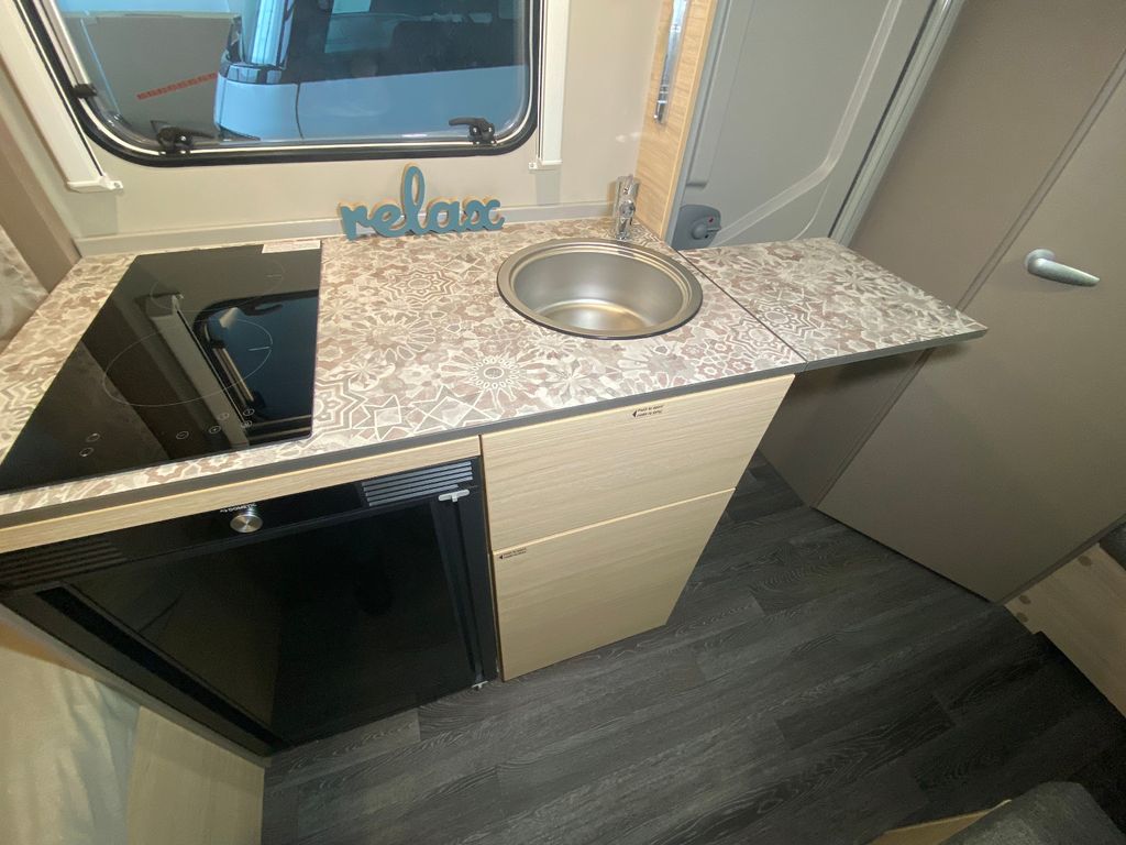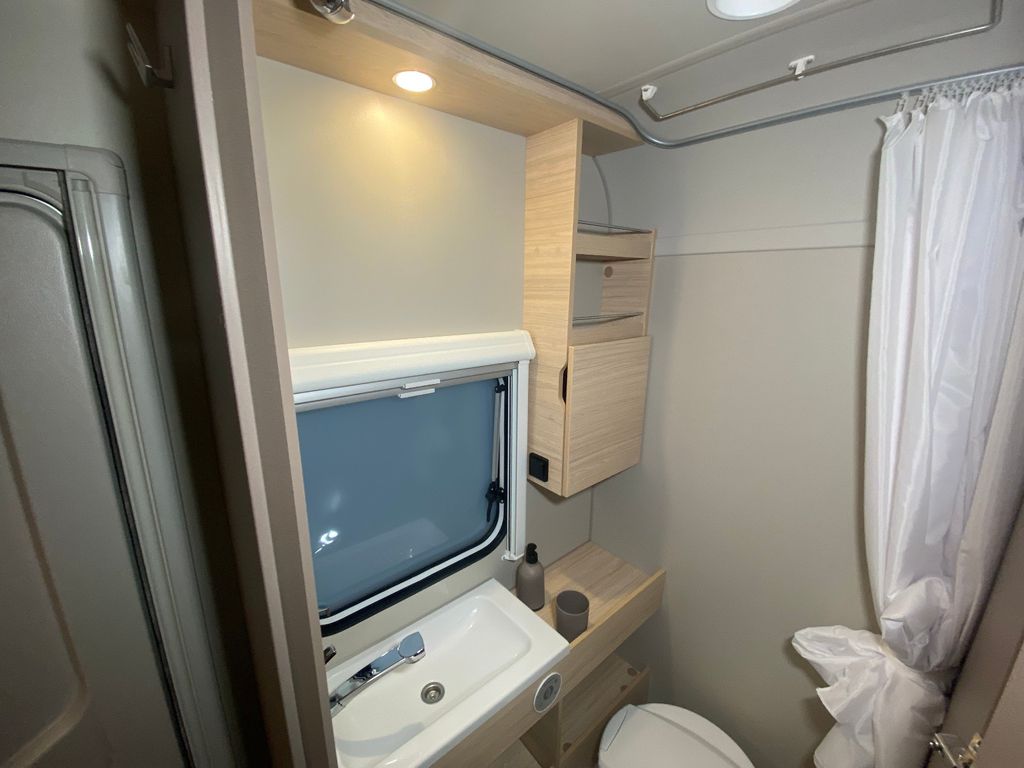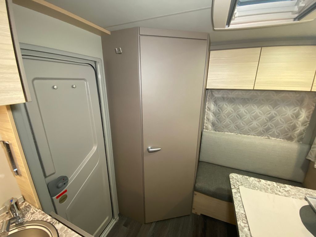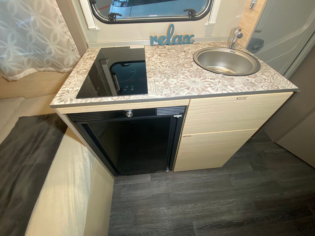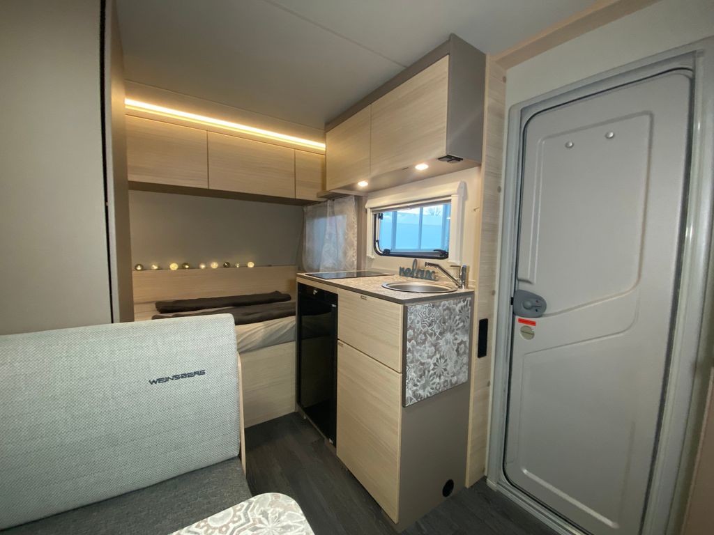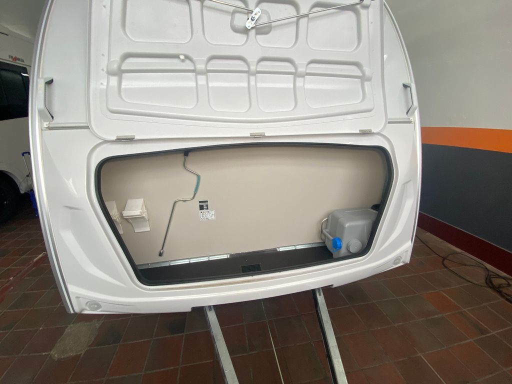 CaraCito Paket Vorzeltleuchte mit Regenrinne in LED Technik, Hydraulische Radstoßdämpfer, Frischwassertank 45 Liter Festeinbau, Schwerlastkurbelstützen, Stabilisator-Sicherheits-Kupplung, Kombi-Rollos an den Fenstern inkl. Verdunklung und Insektenschutz