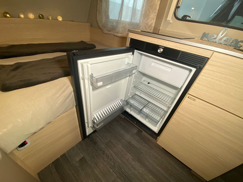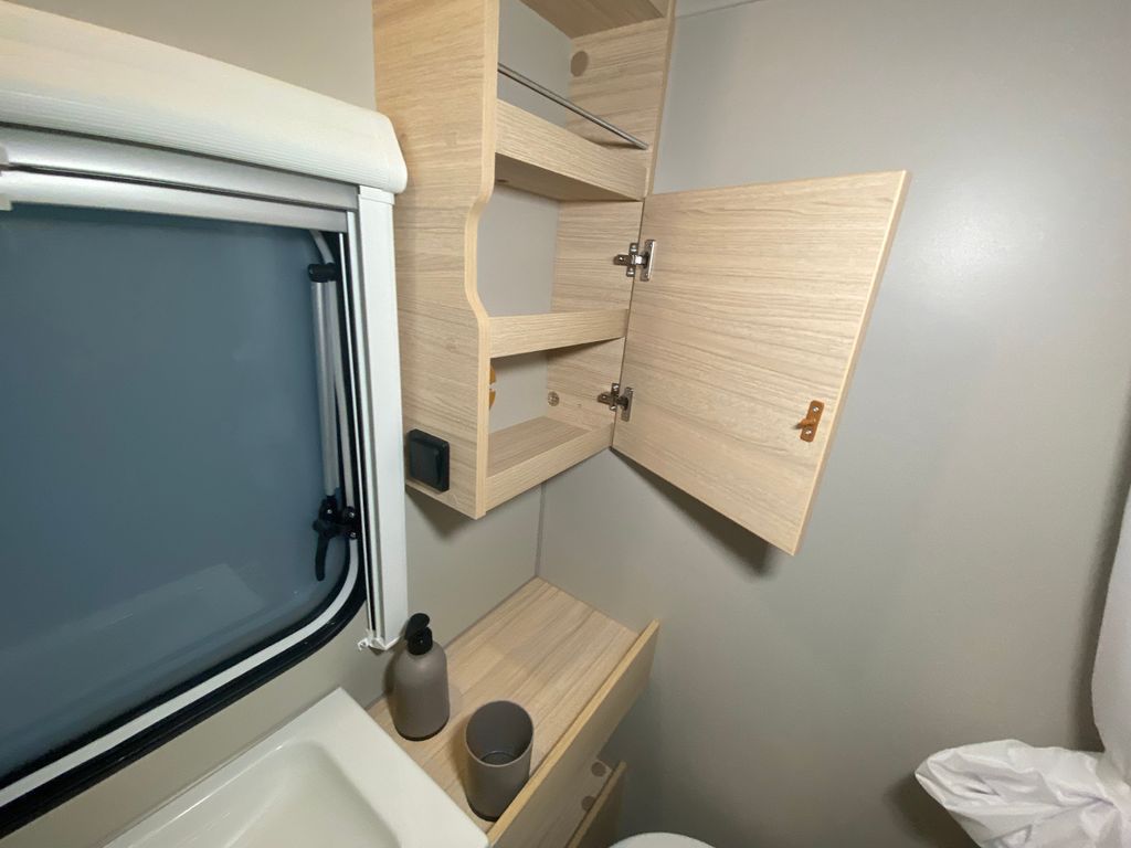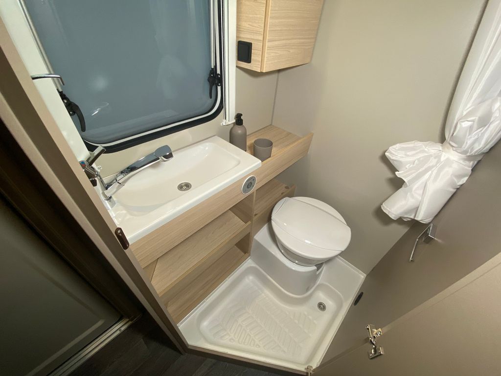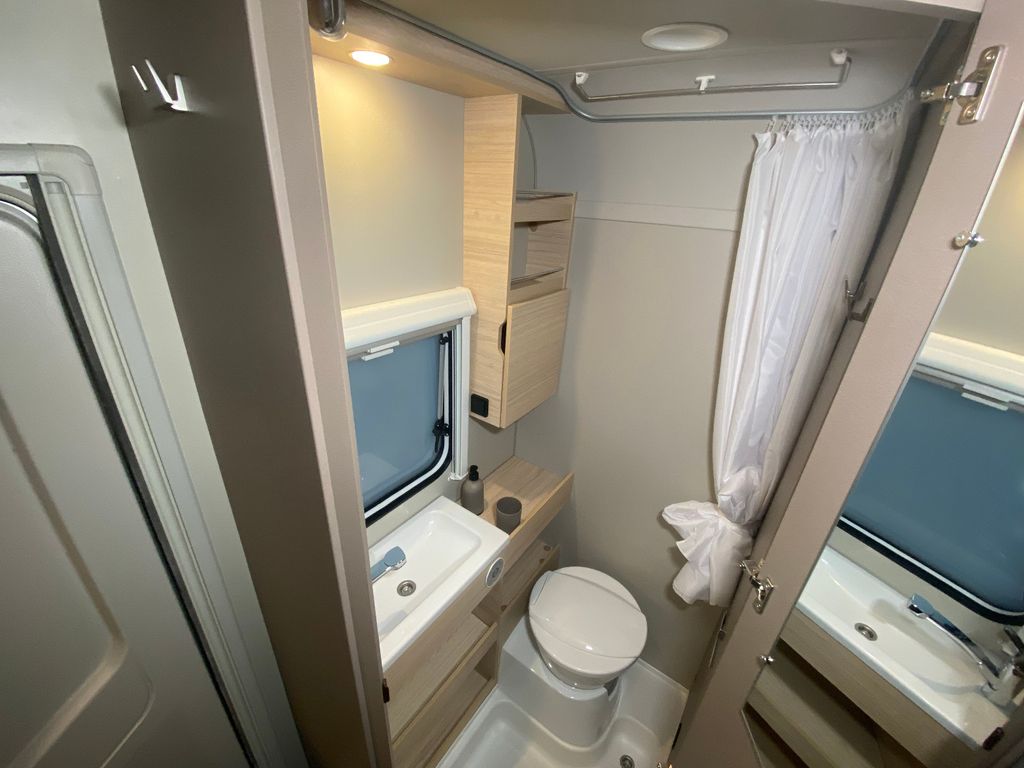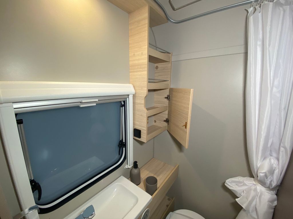 CaraCito Paket Vorzeltleuchte mit Regenrinne in LED Technik, Hydraulische Radstoßdämpfer, Frischwassertank 45 Liter Festeinbau, Schwerlastkurbelstützen, Stabilisator-Sicherheits-Kupplung, Kombi-Rollos an den Fenstern inkl. Verdunklung und Insektenschutz