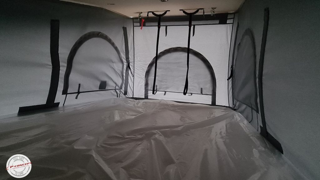 Fahrerhausverdunklungssystem Plissee an Front- und Seitenscheiben, Fliegenschutzgitter hinter Schiebetür