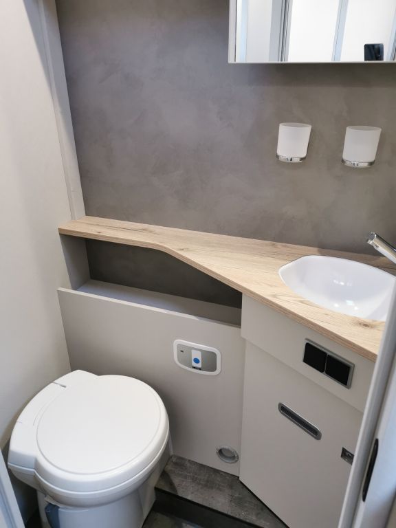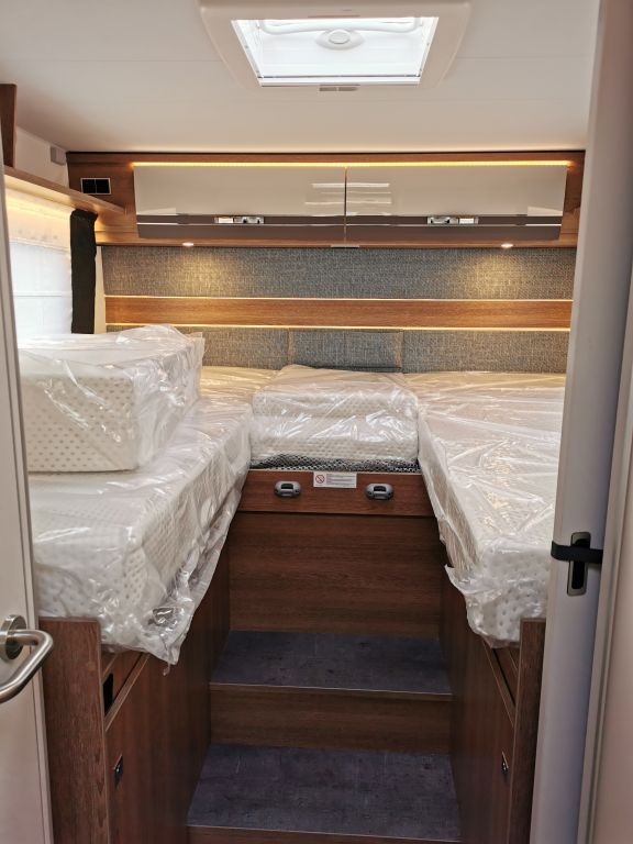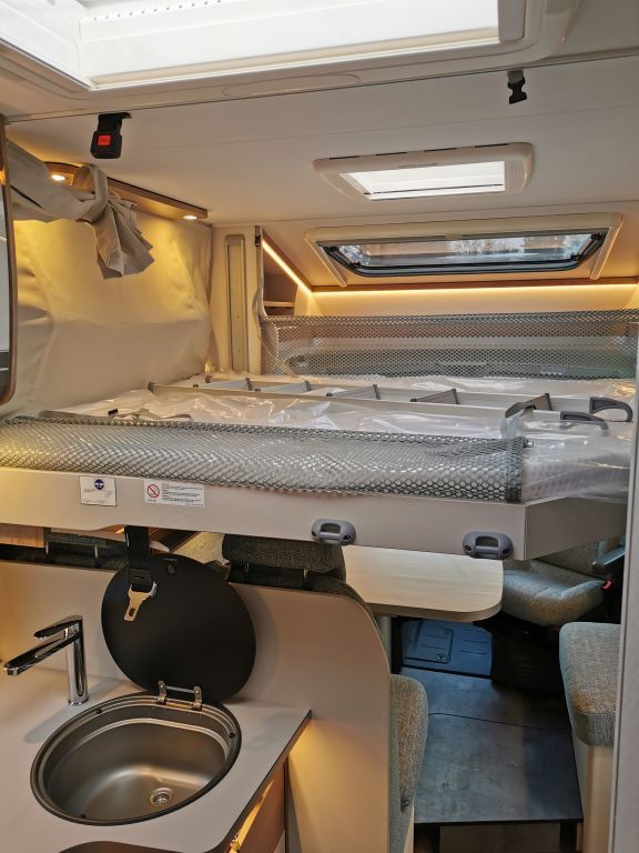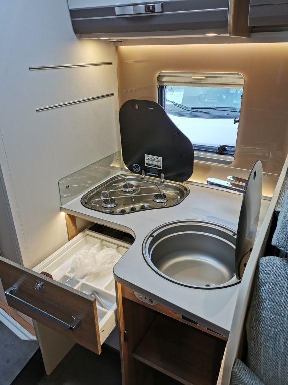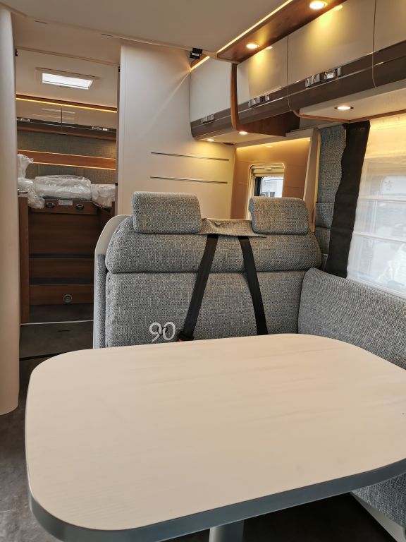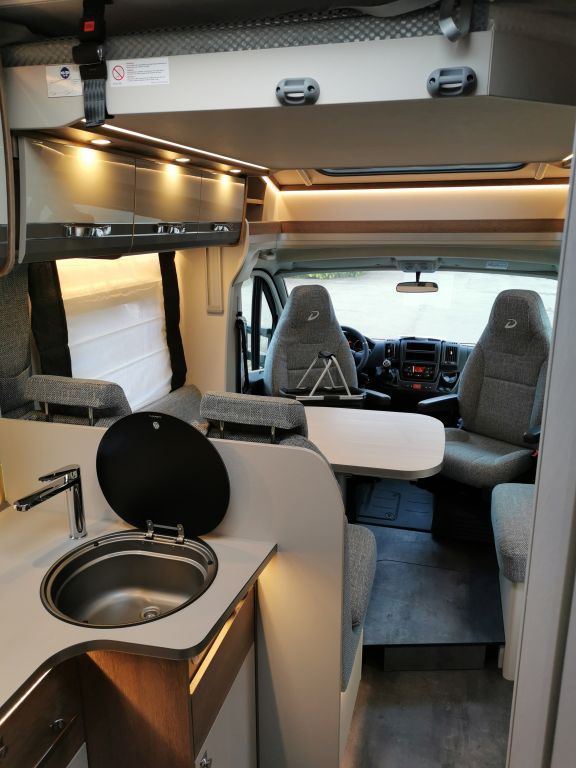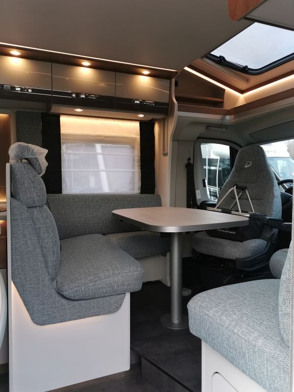 Design-Paket Trend Gemütliche L-Sitzgruppe mit freistehendem, starren Tischfuß und 2 integrierte 3-Punkt-Gurte, Steckdosen und Schalter in Bicolor, Beleuchtete Gurtbankverkleidung, Hinterleuchteter Chromgriff im Eingangsbereich, Neu gestalteter Küchenbereich (Küchenrückwand hinterleuchtet, indirekt beleuchtete Küchenarbeitsplatte, Griff und Handtuchhalter in Chrom), Duschkonsole in schwarz und Badaccessoires NICHT FÜR T 7057 DBL, T 7057 EBL