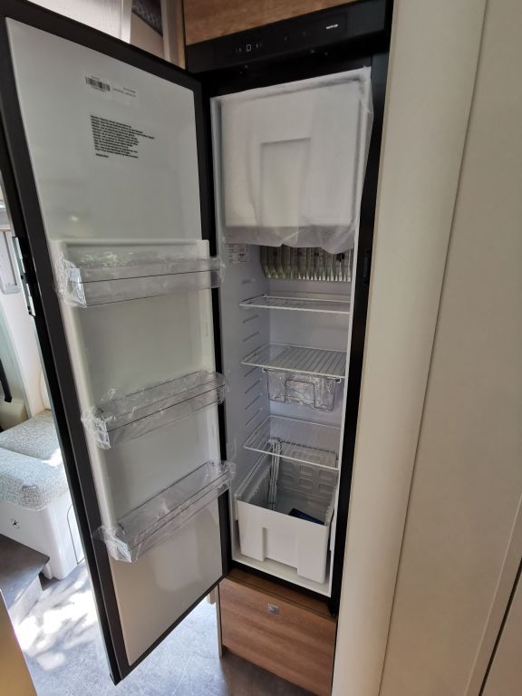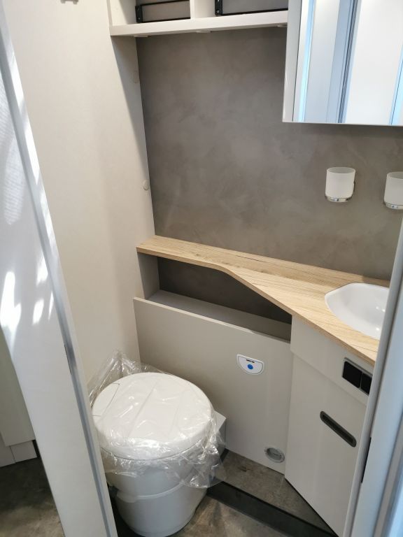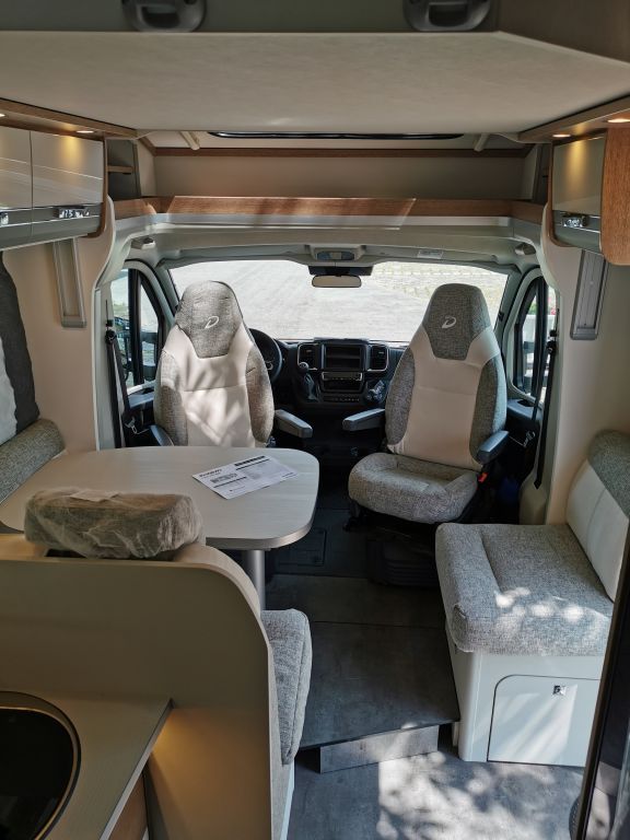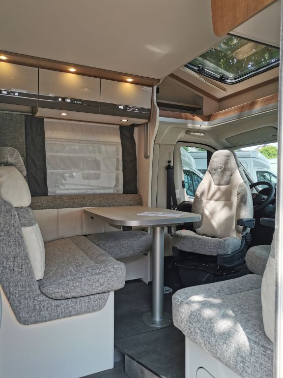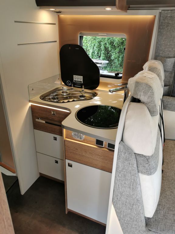 Design-Paket Trend Gemütliche L-Sitzgruppe mit freistehendem, starren Tischfuß und 2 integrierte 3-Punkt-Gurte, Steckdosen und Schalter in Bicolor, Beleuchtete Gurtbankverkleidung, Hinterleuchteter Chromgriff im Eingangsbereich, Neu gestalteter Küchenbereich (Küchenrückwand hinterleuchtet, indirekt beleuchtete Küchenarbeitsplatte, Griff und Handtuchhalter in Chrom), Duschkonsole in schwarz und Badaccessoires NICHT FÜR T 7057 DBL, T 7057 EBL