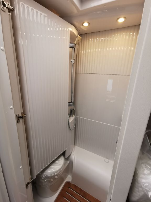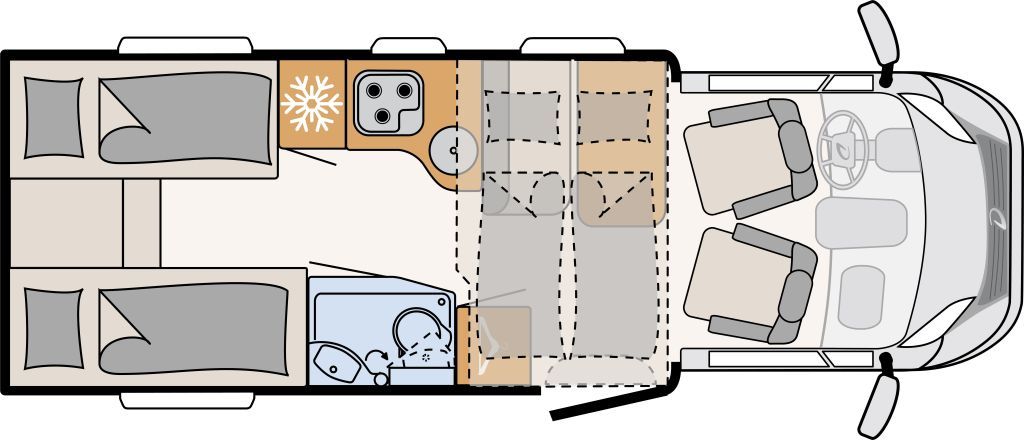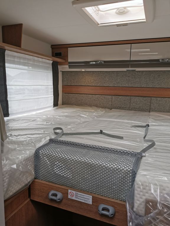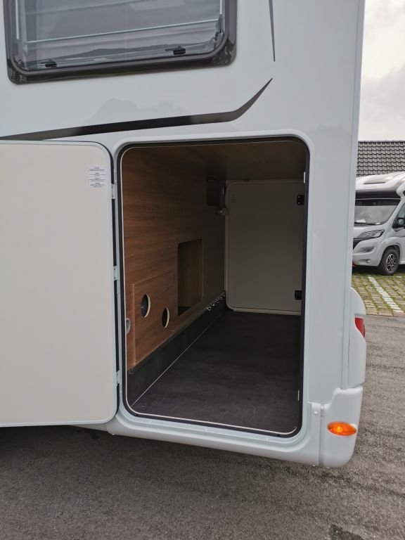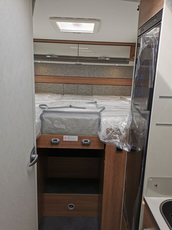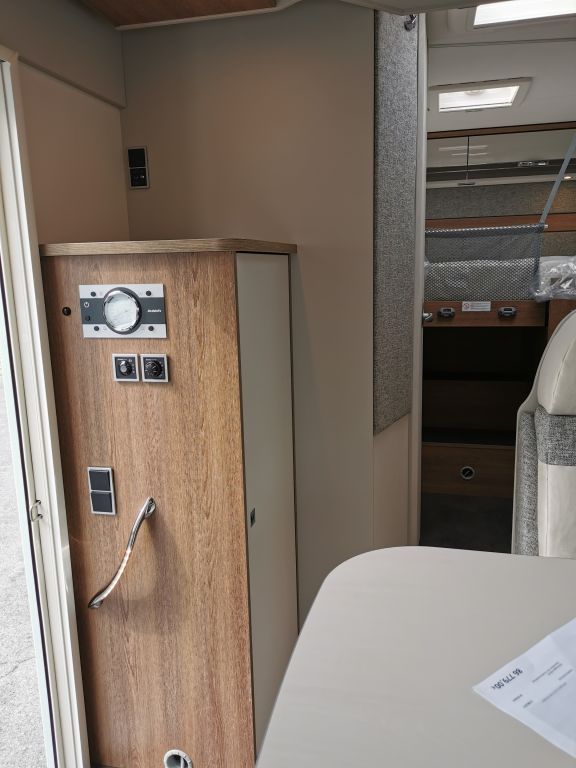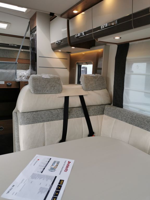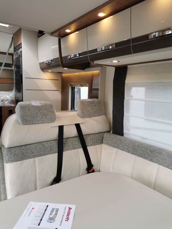 Design-Paket Trend Gemütliche L-Sitzgruppe mit freistehendem, starren Tischfuß und 2 integrierte 3-Punkt-Gurte, Steckdosen und Schalter in Bicolor, Beleuchtete Gurtbankverkleidung, Hinterleuchteter Chromgriff im Eingangsbereich, Neu gestalteter Küchenbereich (Küchenrückwand hinterleuchtet, indirekt beleuchtete Küchenarbeitsplatte, Griff und Handtuchhalter in Chrom), Duschkonsole in schwarz und Badaccessoires NICHT FÜR T 7057 DBL, T 7057 EBL