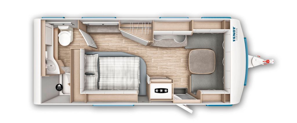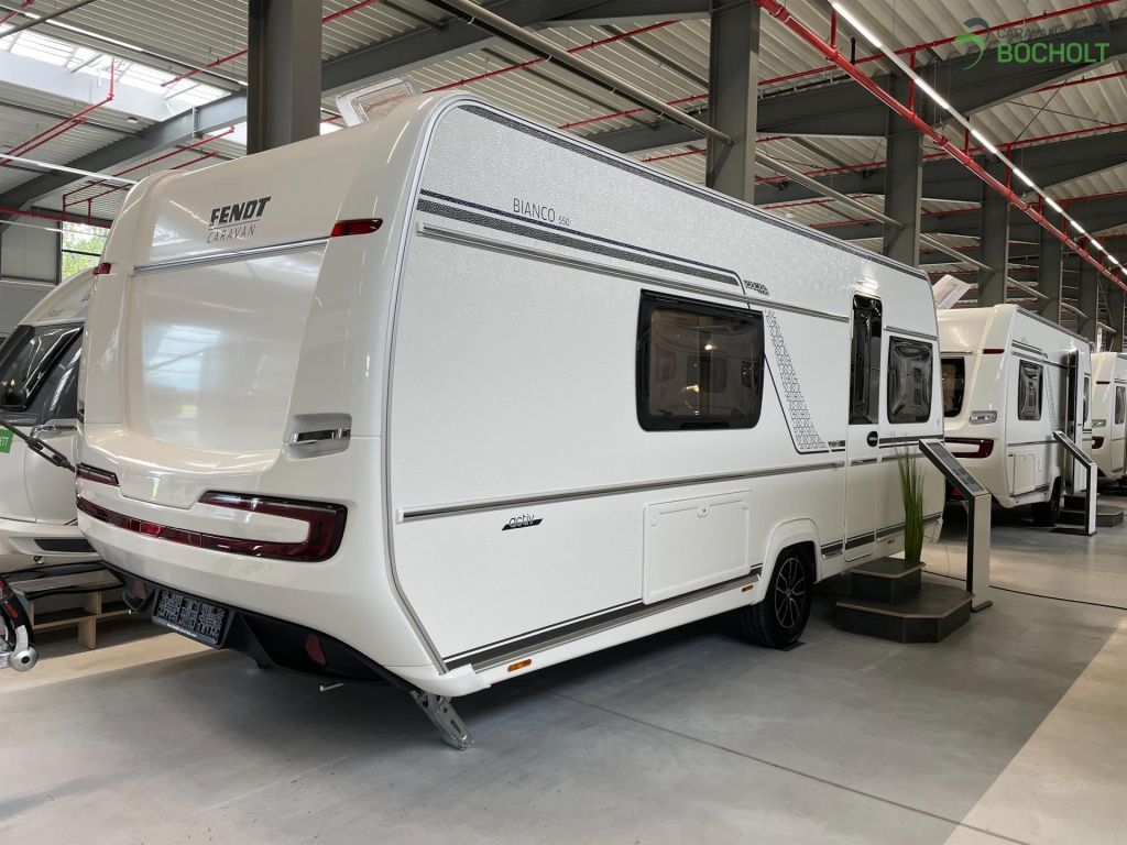Der neue Fendt Bianco Activ 550 SD Modell 2025 mit französischem Bett, gemütlicher Sitzgruppe, Küchenzeile und Heckbad. Polster Almeria steht als Musterwagen bei uns in der Ausstellung.