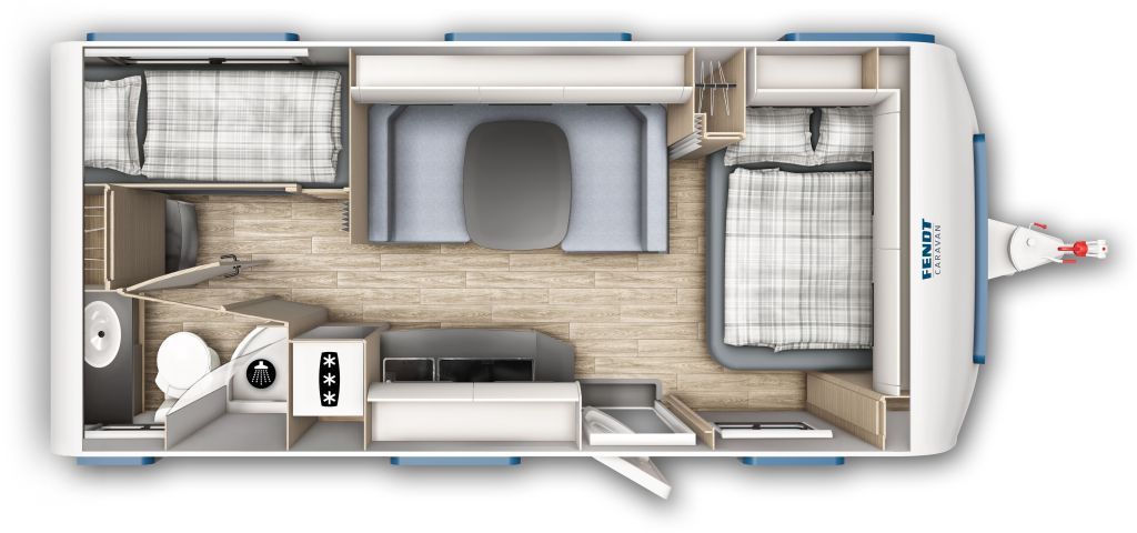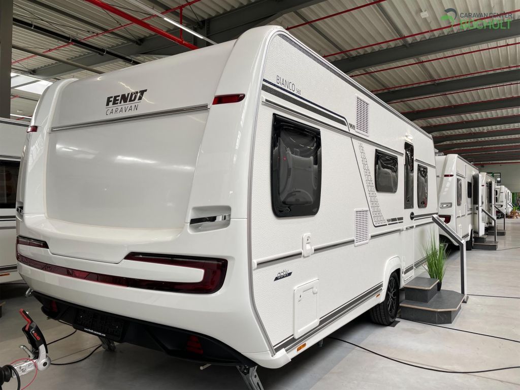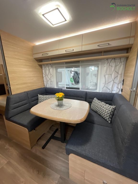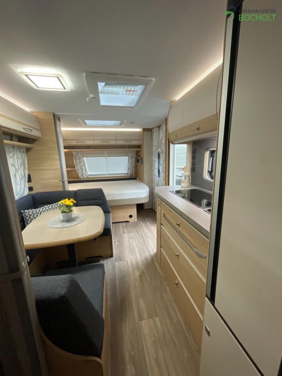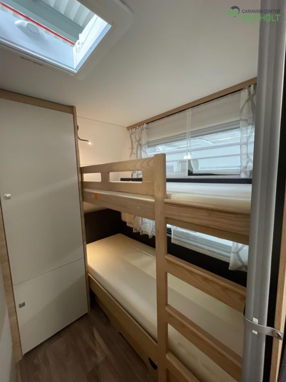 Der neue Bianco Activ 560 SKM Modell 2025 ist ein Wohnwagen für die ganze Familie mit französischem Bett, Etagenbetten, einer gemütlichen Mittelsitzgruppe, einer schönen Küchenzeile, Bad mit Dusche, Polster Pula und steht als Musterwagen bei ins in der Ausstellung.