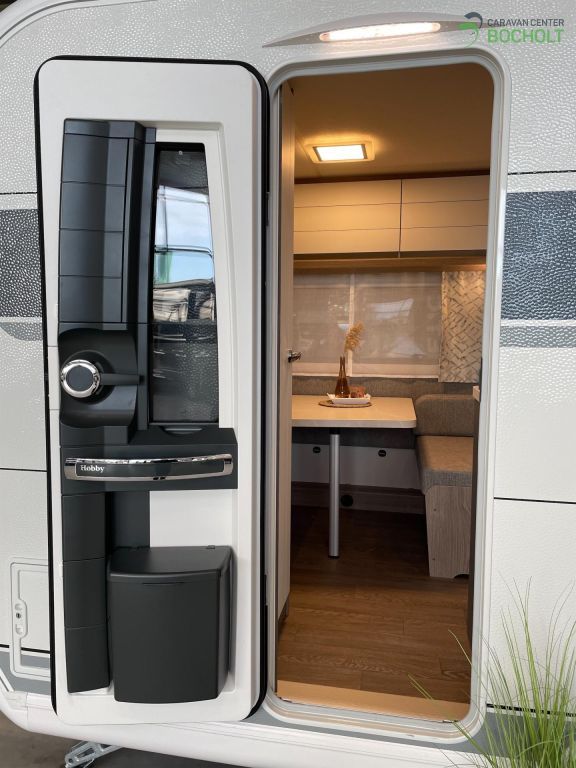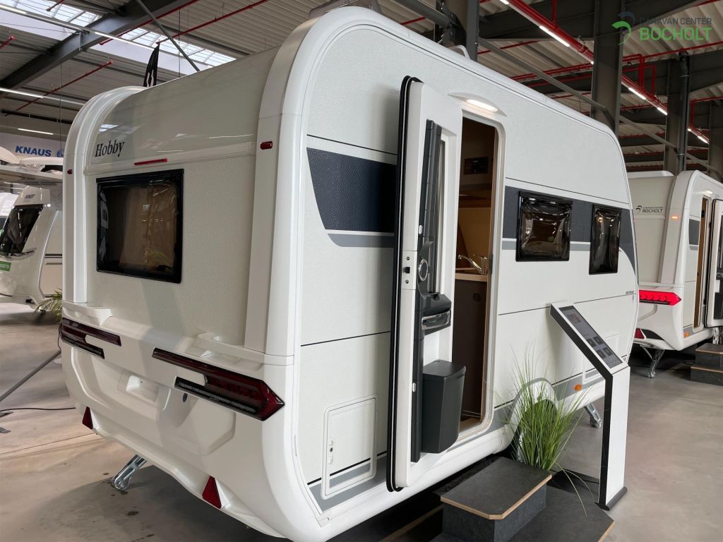 Der neue Hobby On Tour 390 SF Modell 2025 mit einem Querbett, Seitensitzgruppe und Küchenzeile. Der Musterwagen steht zur Ansicht in unserer Ausstellung.