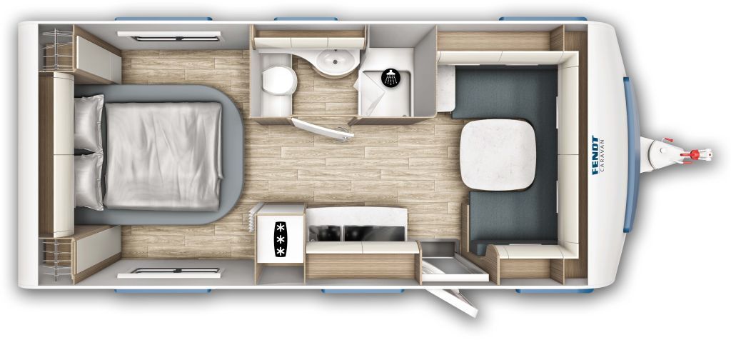 Der neue Fendt Tendenza 560 SFDW Modell 2025 mit einem Queensbett, einer schönen Küchenzeile, einer gemütlichen Rundsitzgruppe und ein Bad mit Dusche, Polster Cannes