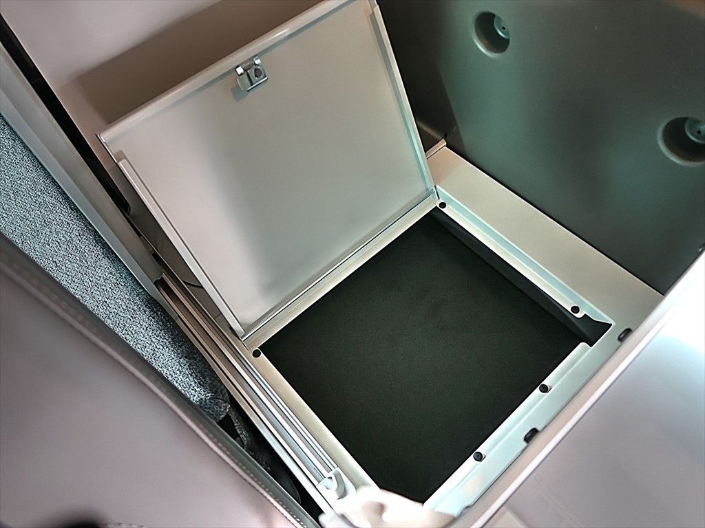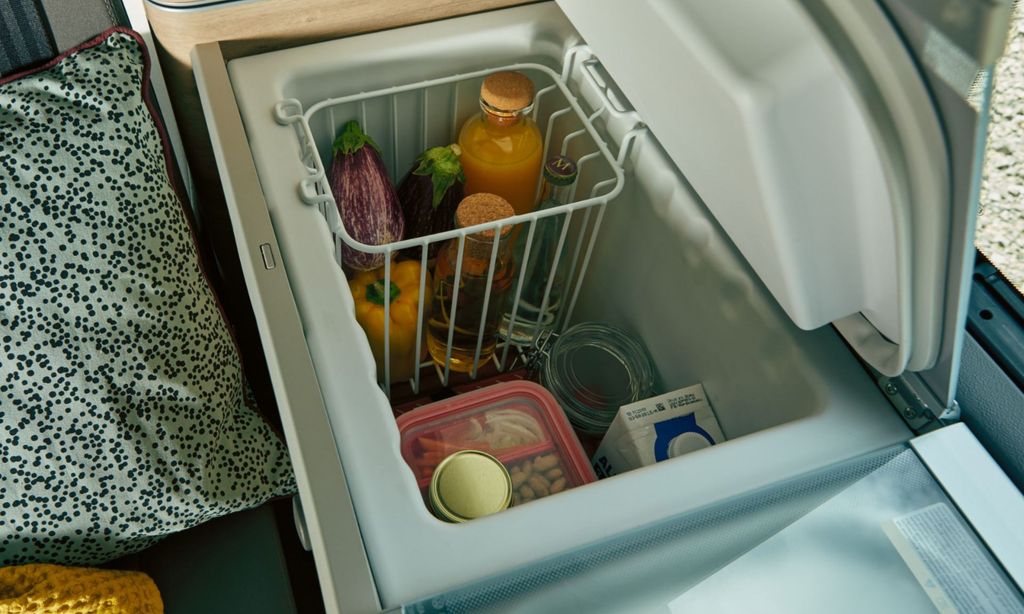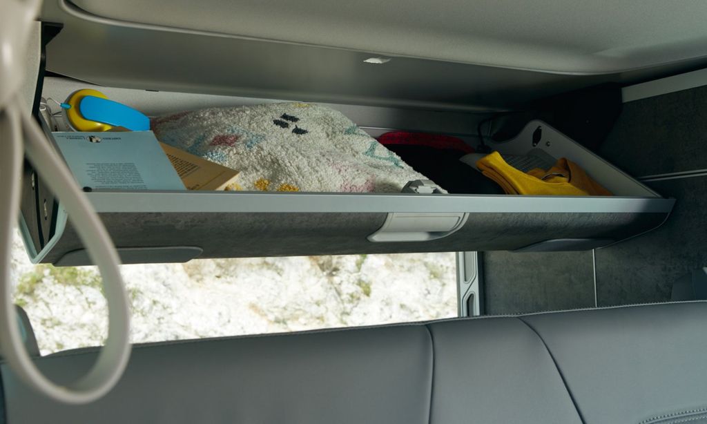 Netzablage in Aufstiegsöffnung des Dachbettes und 2. Schublade in der Sitzbank