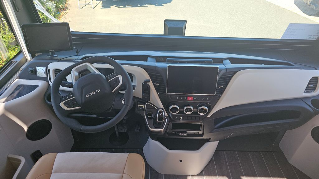 Wohnraumdesign Leder (Iveco Daily) bestehend aus Armaturenbrett teillackiert bicolor, Motortunnel hell beledert, Armaturenbrettanpassung sowie Seitenverkleidung (mit Kartenfach und Flaschenhalter) rechts und links hell beledert
