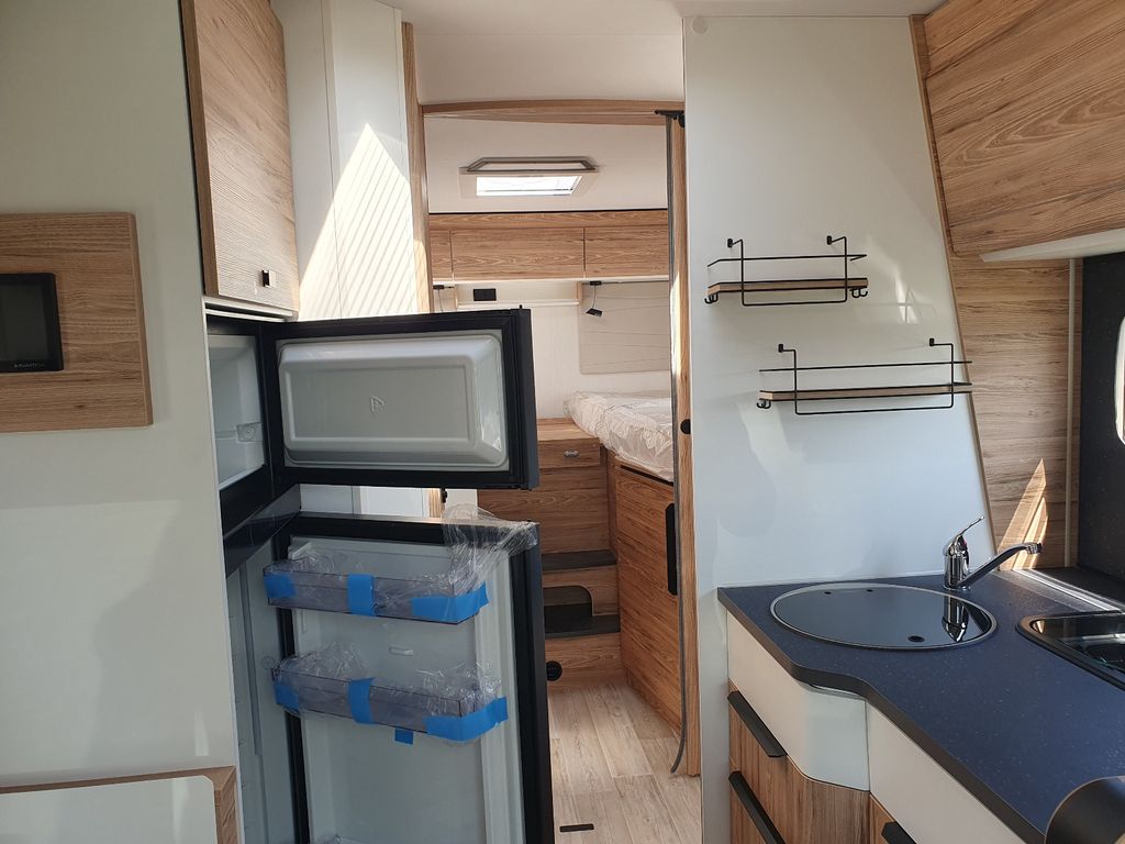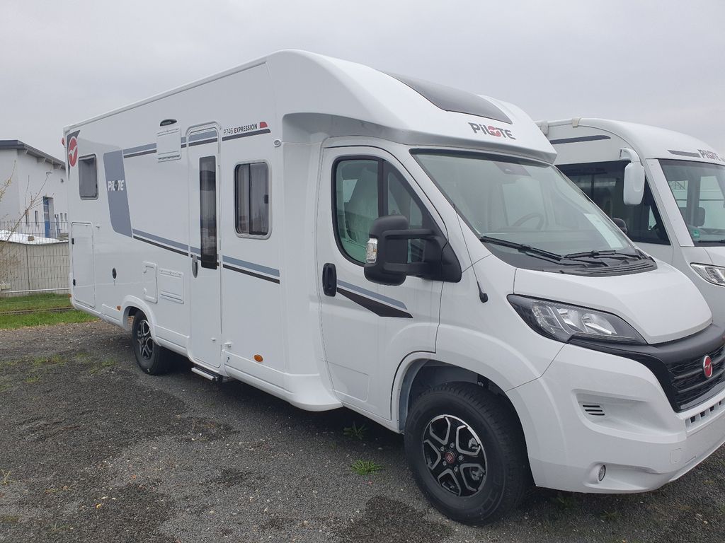 Mit seinen 7,45 m Länge präsentiert sich der P746 FGJ als komfortabler Teilintegrierter für 4 Personen mit Einzelbetten, Hubbett und Wohnbereich mit gegenüberliegenden Sitzbänken . Jeder Bereich ist einladend gestaltet und vom Rest abgetrennt.