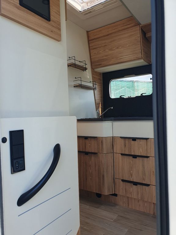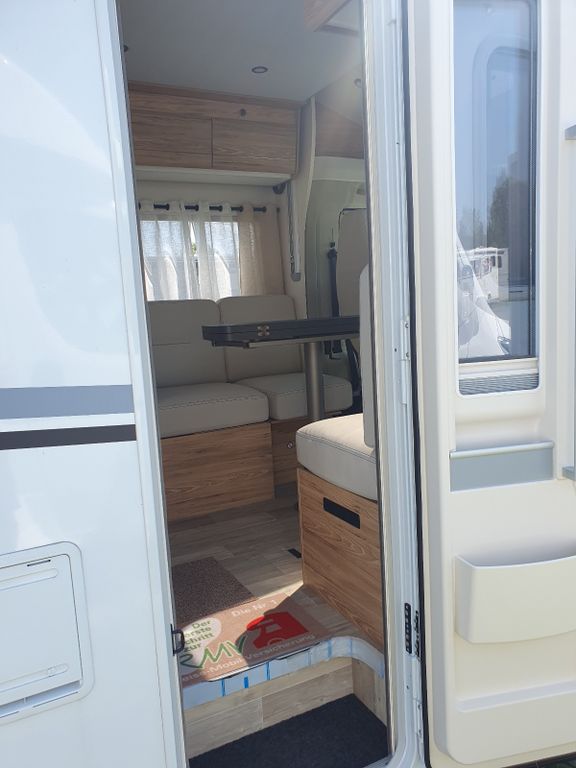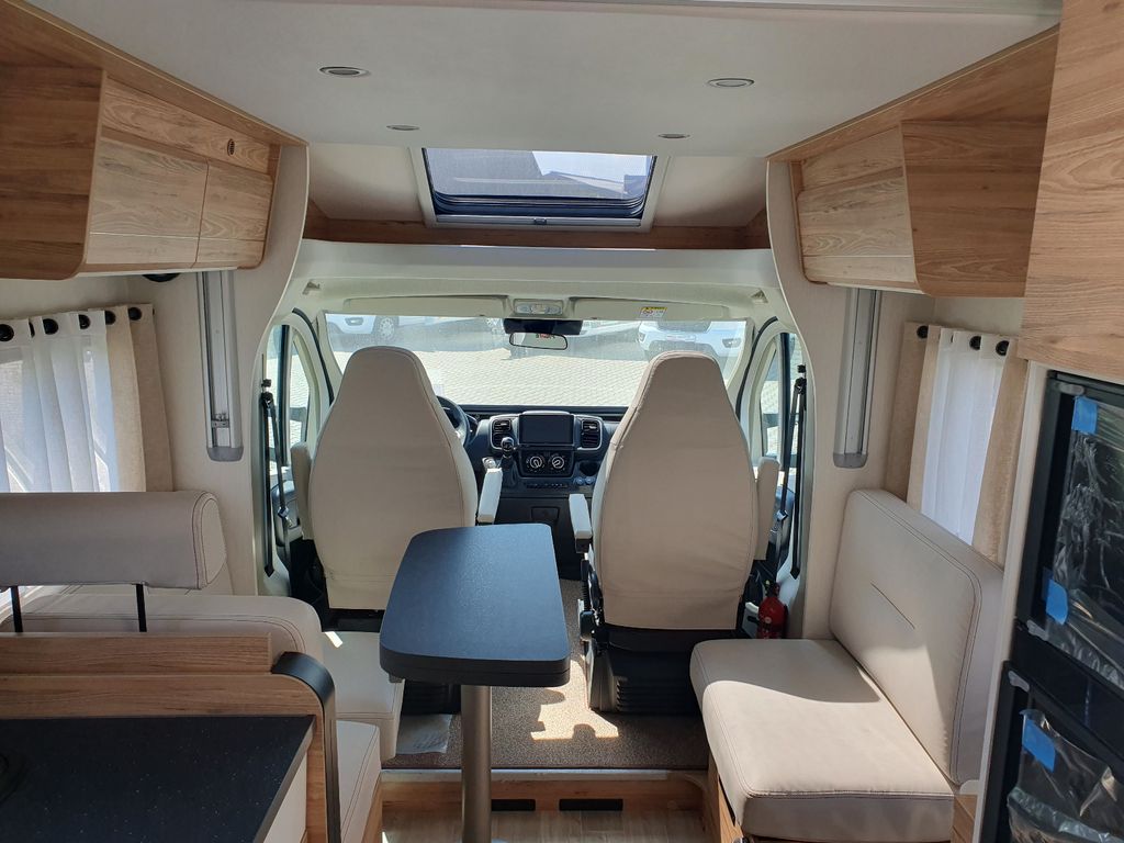 Dieser Teilintegrierte verfügt über einen großen Wohnbereich mit gegenüberliegenden Sitzbänken. Die Essecke mit Klapptisch bietet Platz für 5 Personen. Der perfekte Kompromiss zwischen Gemütlichkeit und Bewegungsfreiheit. Dort finden Sie auch das Hubbett für 2 Personen.