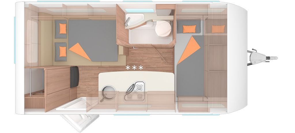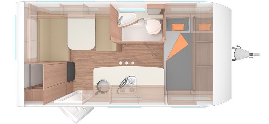 Smart-Paket (Frischwassertank 45 Liter Festeinbau, Schwerlastkurbelstützen, Stabilisator-Sicherheitskupplung, Umluftanlage 12 V, Kombi-Rollos an den Fenstern inkl. Verdunklung und Insektenschutz)