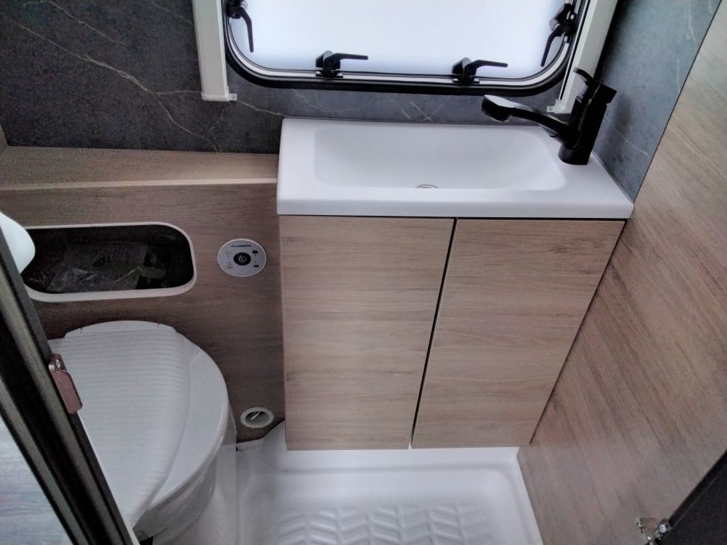 Advanced-Paket (TRUMA Therme mit Anschluß für Küche und T-Raum, Dachhaube (Hebe-Kipp) 70 x 50cm mit Insektenschutz und Verdunklung Heck, Abwassertank 25 Liter rollbar, Duschausbau Waschraum Brausearmatur mit Halter und Duschvorhang, Insektenschutztür)