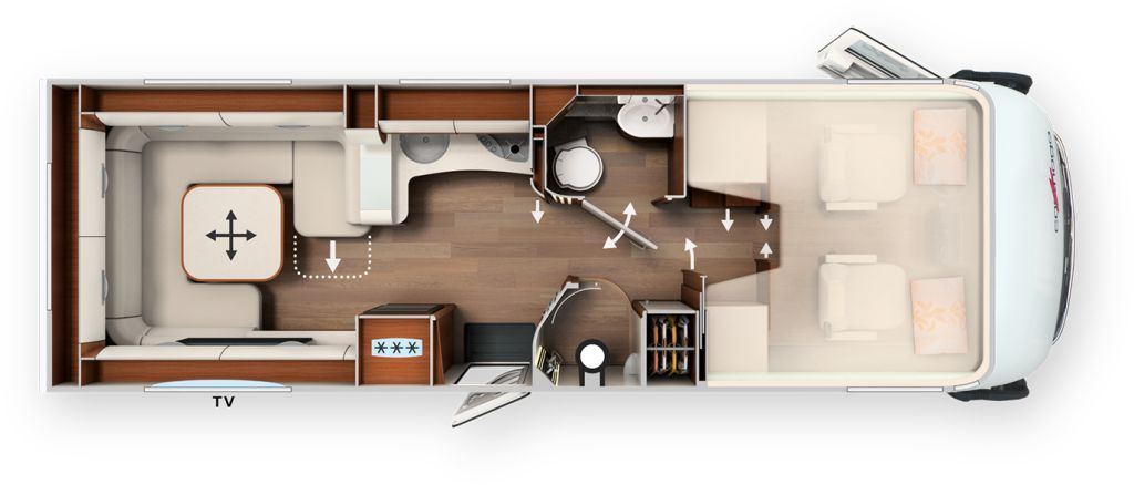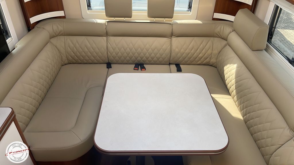Mit dem einzigartigen 4-Raum-Konzept bietet der vollintegrierte liner-for-two herausragenden Komfort und einzigartige Raffinessen. Im vorderen Bereich des Wohnmobils befinden sich elektrisch absenkbare Längseinzelbetten mit einer großzügigen, durchgängigen Liegefläche. Im hinteren Teil erwartet Sie eine exklusive Lounge-Rundsitzgruppe.