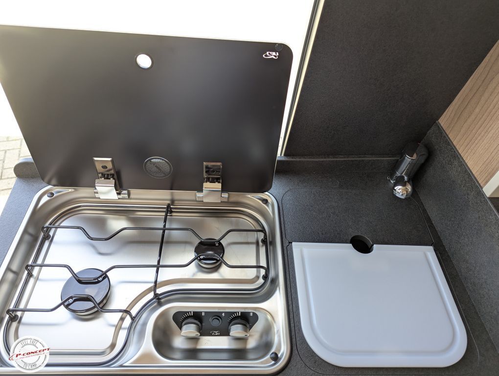 Upgrade Küchencenter (Arbeitsflächenerweiterung, Spülbeckenabdeckung geteilt mit Schneidebrett, Fronten in creme offen)