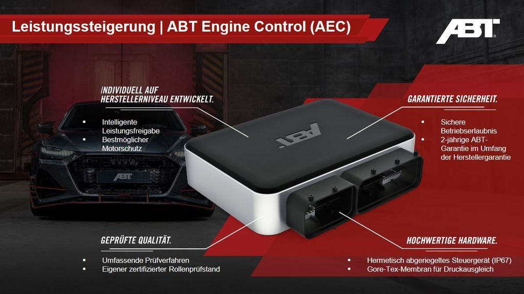 Für Fahrer, die Freude an mehr Leistung haben ist dieses Tuning-Komplettpaket von ABT genau richtig. Bei dieser Technologie kommt die ABT Power-Software in einem zusätzlichen Steuergerät zum Einsatz. Ihre Vorteile Das Seriensteuergerät bleibt unangetastet und das Fahrzeug vollständig diagnosefähig.