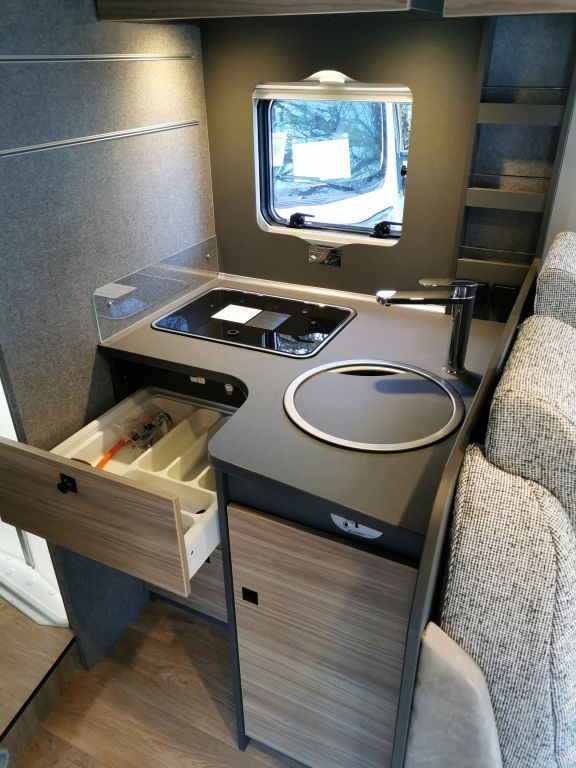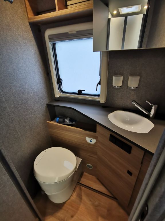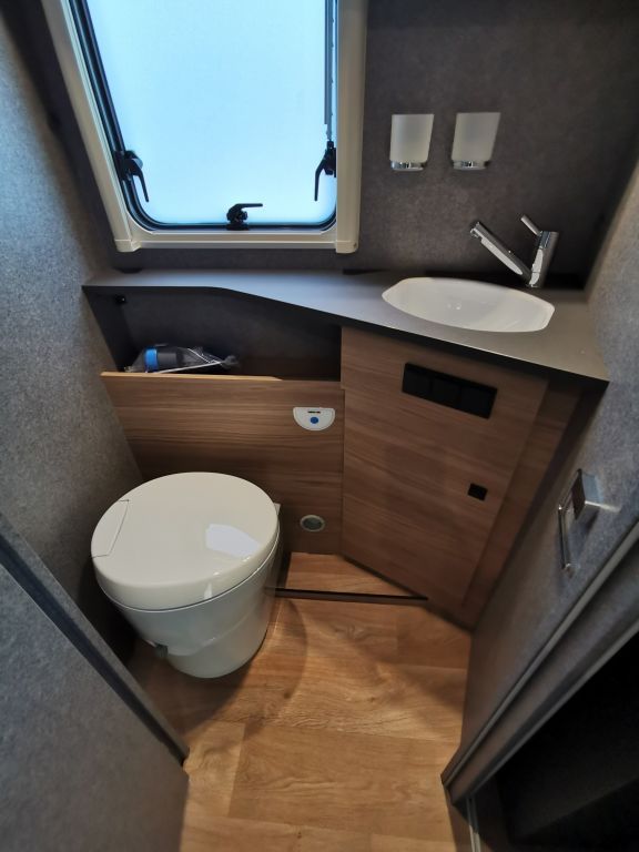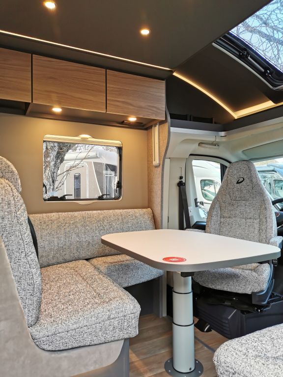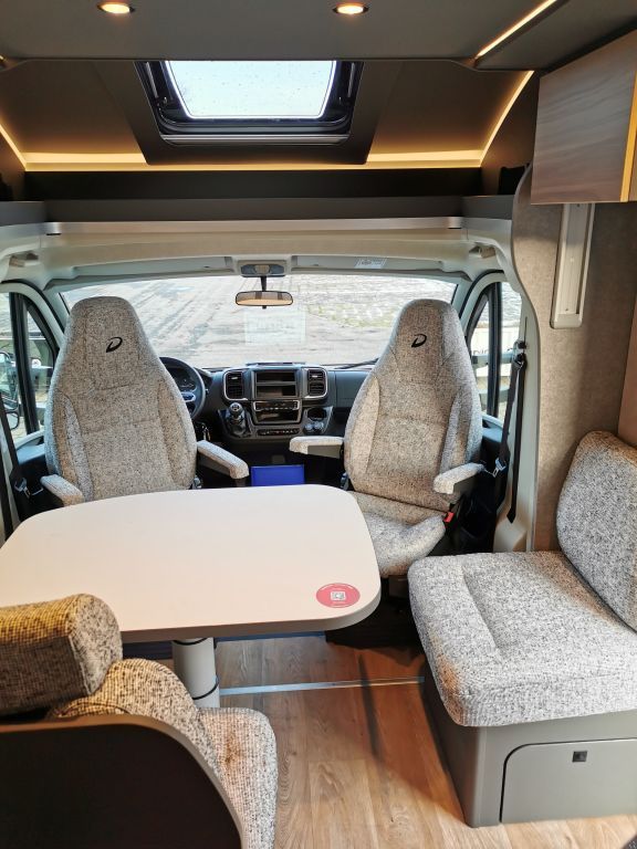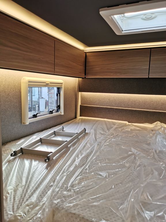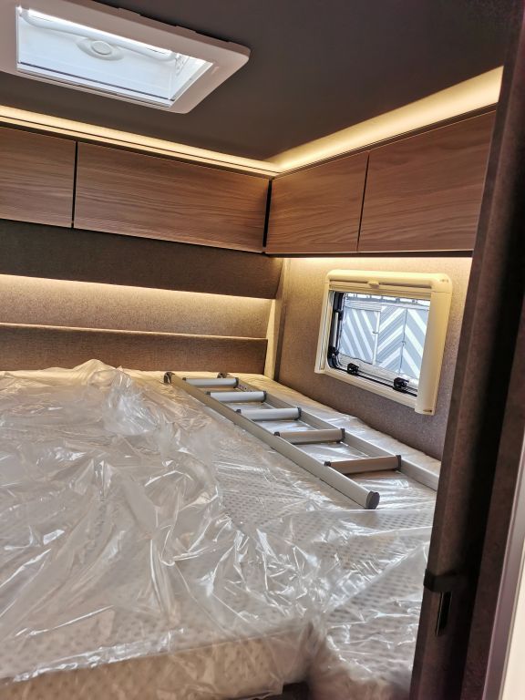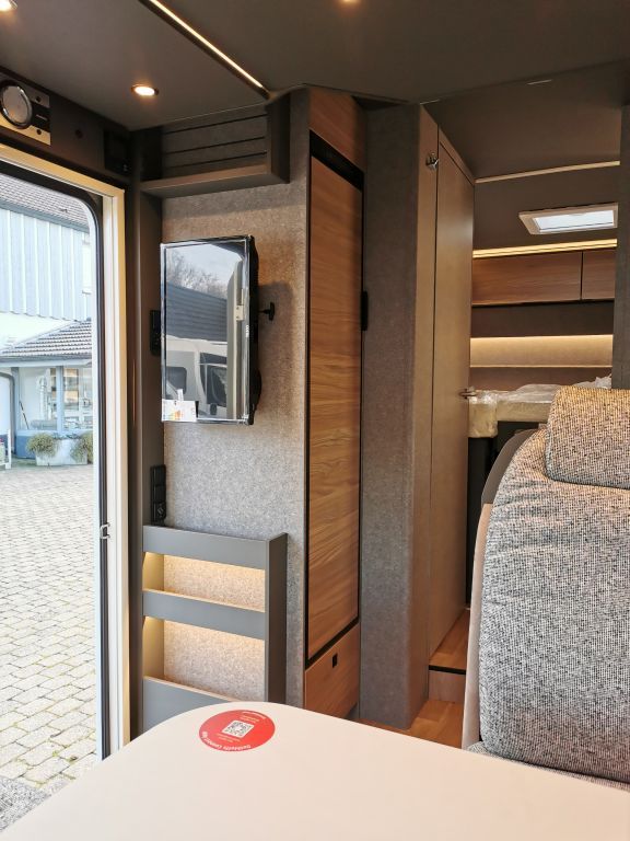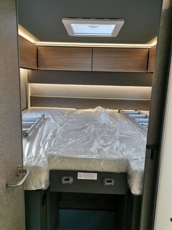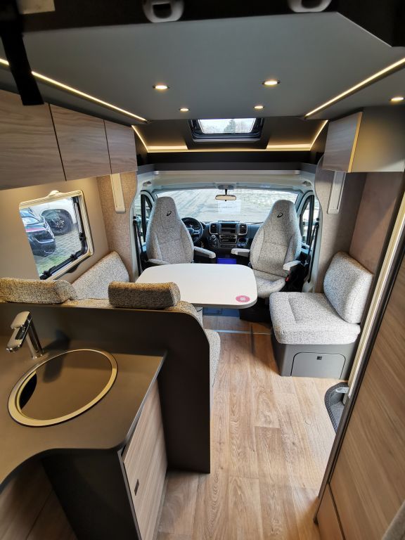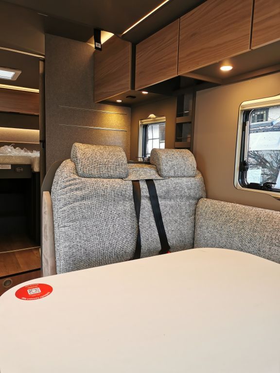 Family-Paket T 6817, 7057 EB (Wohnraumtür mit Fenster inkl. Verdunkelung und Zentralverriegelung (inkl. Fahrerhaustüre), Verdunklungsjalousien im Fahrerhaus, Vorbereitung für Radiosystem inkl. Soundpaket im Fahrerhaus, Indirekte Ambientebeleuchtung über den Dachstauschränken, Indirekte Wandflächen-Ambientebeleuchtung, Küchenrückwand beleuchtet, Indirekte Beleuchtung im Badezimmer mit beleuchteter Duschkonsole, Eingangsmodul mit indirekter Beleuchtung, Verkleidete Sitztruhenwange mit indirekter Beleuchtung, Gemütliche L-Sitzgruppe mit freistehendem, absenkbarem Tischfuß und 2 integrierte 3-Punkt-Gurte, Bettumbau Einzelbetten zu Doppelbett)