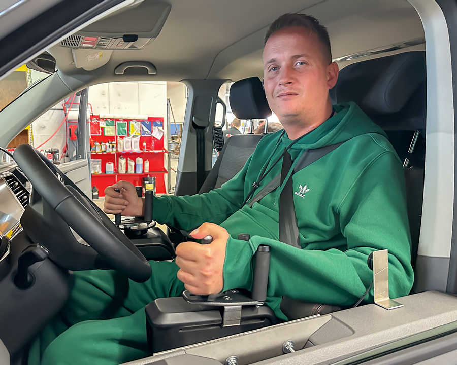 Die Technik war bereit, die Möglichkeiten vielfältig. Doch nun musste erst einmal exakt angepasst und dann geübt werden. Im letzten Schritt zurück in die eigene mobile Unabhängigkeit hieß es Trainingseinheiten in der Paravan-Fahrschule absolvieren. Für Philip kein Problem. Dank seiner beruflichen Erfahrung mit Baumaschinen, kam er schnell mit der Technik zurecht. Die Bedienlogik des Space Drive Systems stellte für ihn kein Problem dar. So absolvierte er schließlich erfolgreich die Fahreignungsprüfung direkt bei Paravan. Ein „Fahranfänger“-Schild am Heck des Fahrzeugs begleitet ihn seither. Nicht, dass Philip nicht längst wieder sicher im Straßenverkehr unterwegs wäre, das Schild dient vielmehr der Rücksichtnahme anderer und verschafft ihm etwas mehr Raum, was nicht zuletzt auch für den Kopf wichtig ist. Schließlich beginnt der erste, entscheidende Schritt zurück in die eigene Mobilität im Kopf.